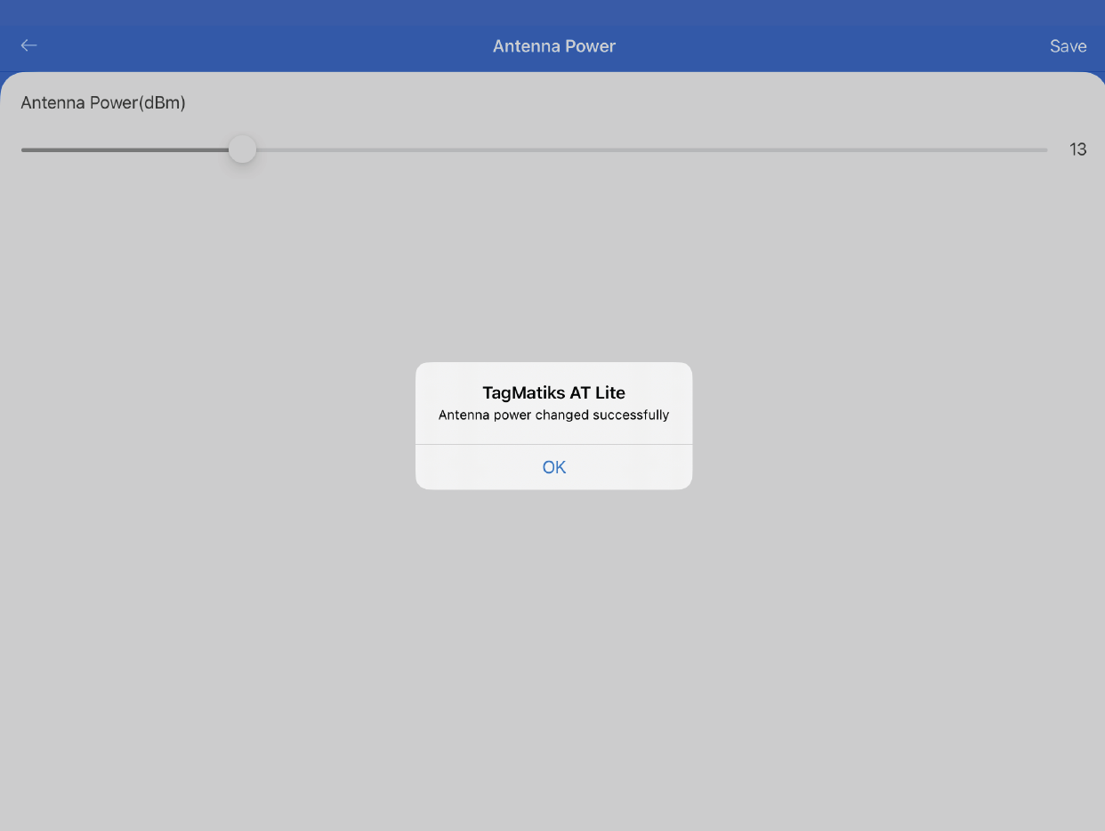 6. Decrease the power of the RFID reader and tap on Save. An acknowledgement will appear “Antenna power changed successfully” as shown in the image below.