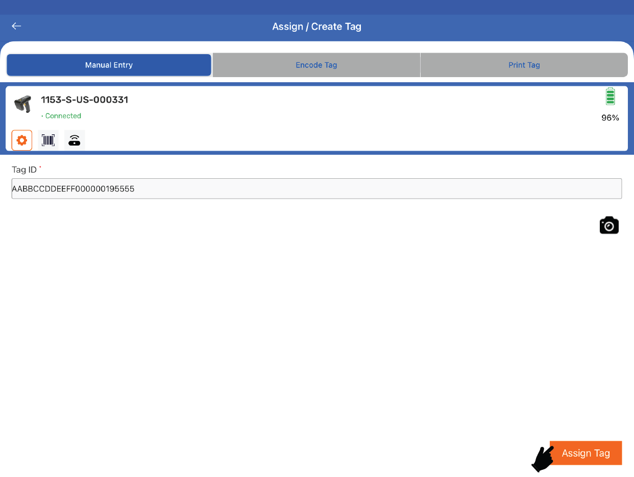 7. Go back to the menu and keep the desired tag isolated from any other RFID tags. Press the trigger of the reader to read the nearby tag. It will autofill the Tag ID column. If there are other tags in the vicinity, they will also show up in a list, select the desired one and tap on Assign Tag.