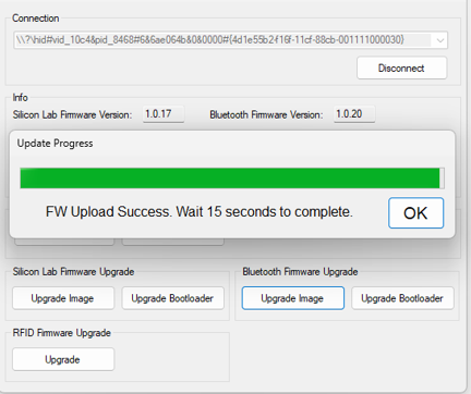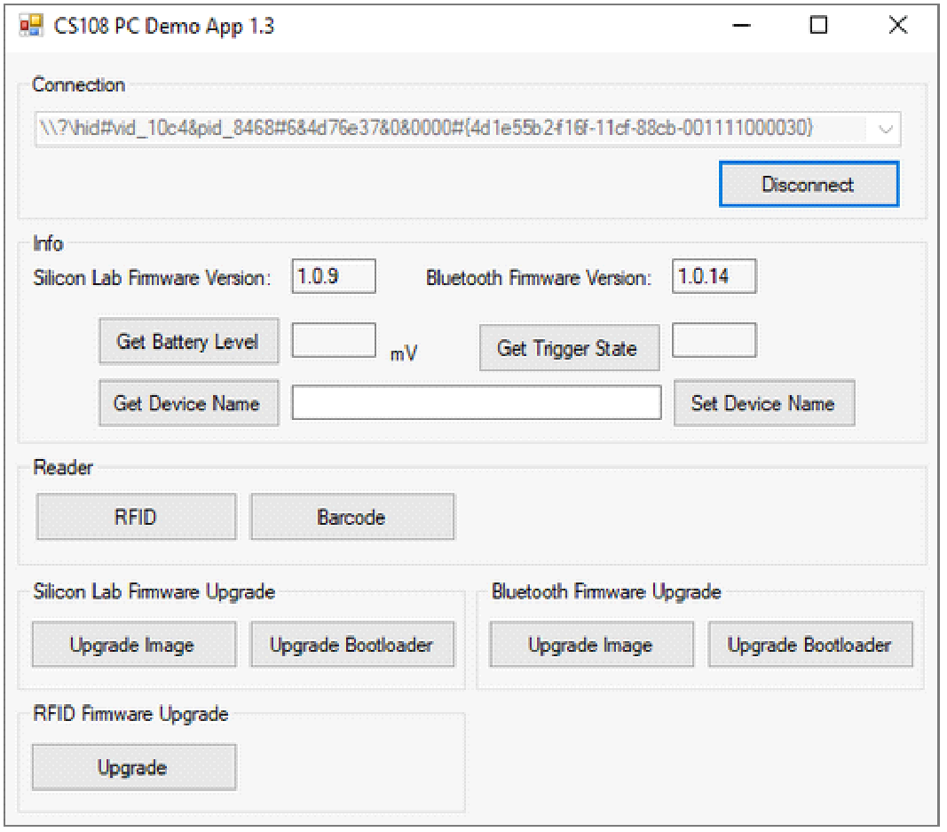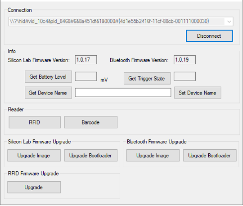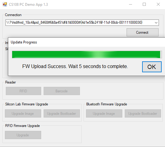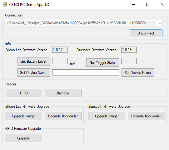 6. This will bring you back to the main window. You are still connected to the CS108/CS710S reader. Your RFID firmware upgrade is now completed.