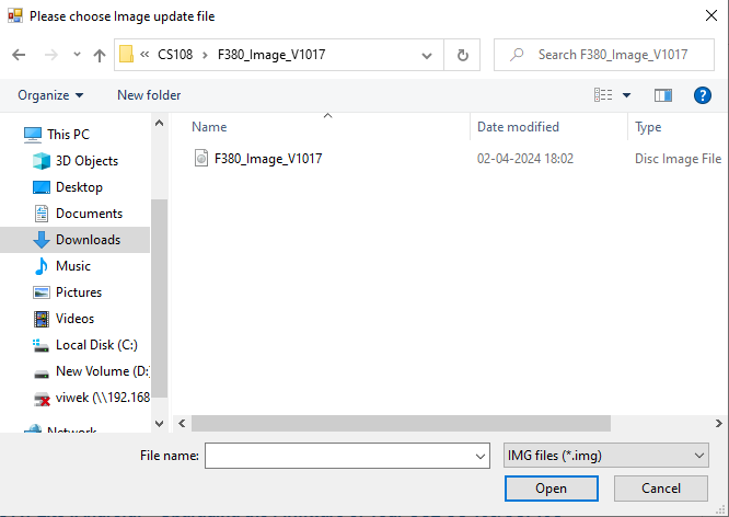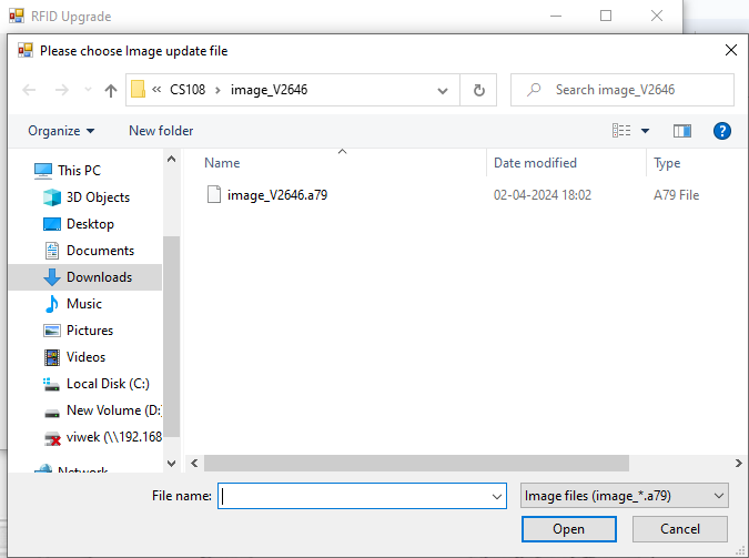 3. Then click on the “Upgrade Image” button, a file open window pops up. Select the RFID firmware with a .a79 extension and Click on the “Open” button option.