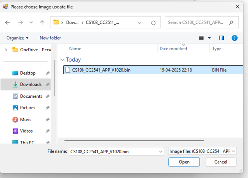 2. Select the Bin file for Bluetooth firmware upgrade and Click on the open button. As shown in Fig 0.9.