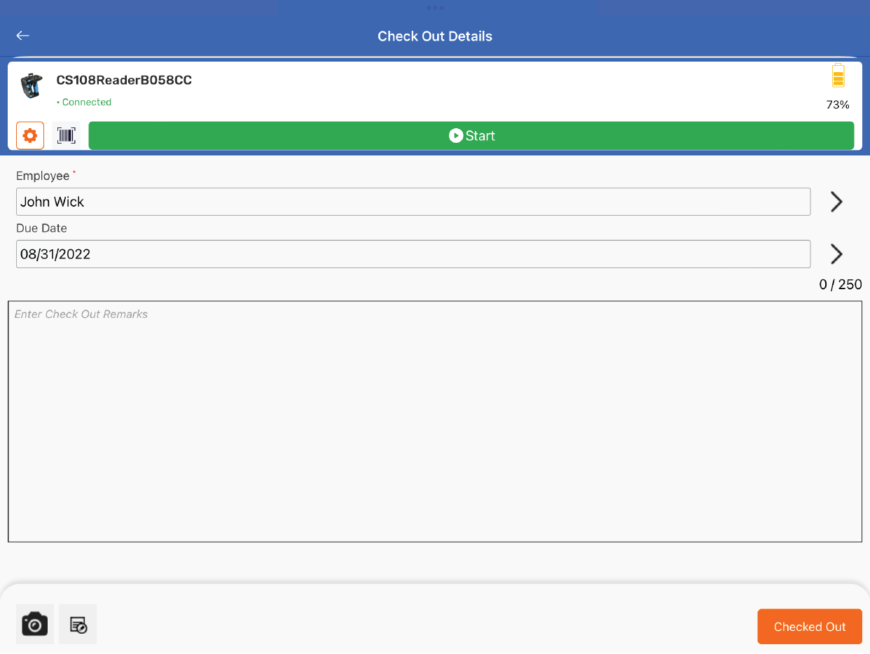 The checkout transaction is designed to help keep track of assets as they are checked out to individuals. To get started, scan one or more assets on the Checkout page. You have a variety of options in terms of how you can scan. Depending on the device you’re using, you can either press the trigger/button on the device or press the Start Scan button. TagMatiks AT Lite does also support barcode scanning or manual entry for assets. You can click the icons across the bottom of the screen to get started on that.