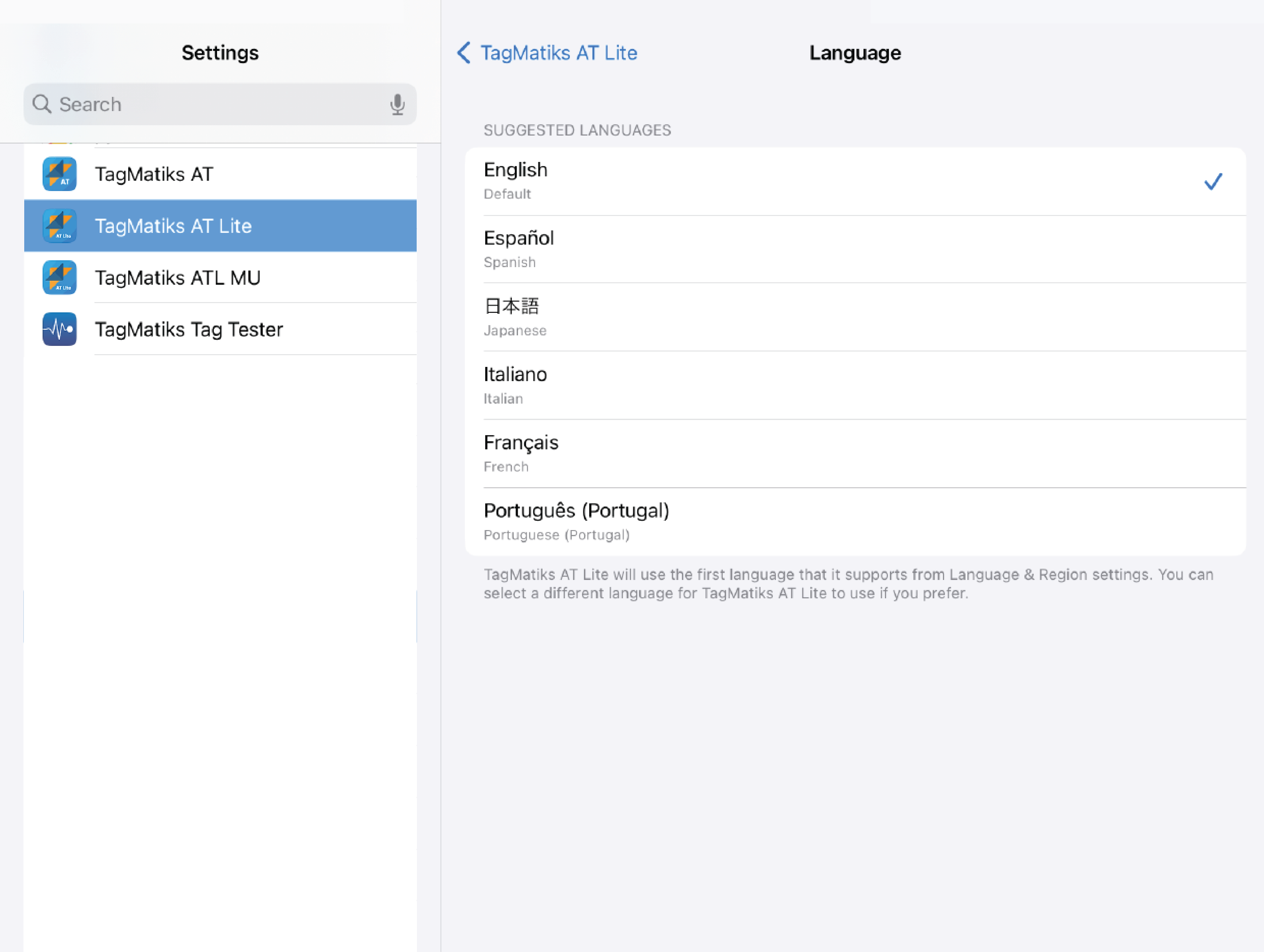 TagMatiks AT Lite automatically changes to the supported languages above if the target device is set to that language. To update your language for your iOS device, please go to the iOS Settings application. General -> Language & Region and then choose your desired language.