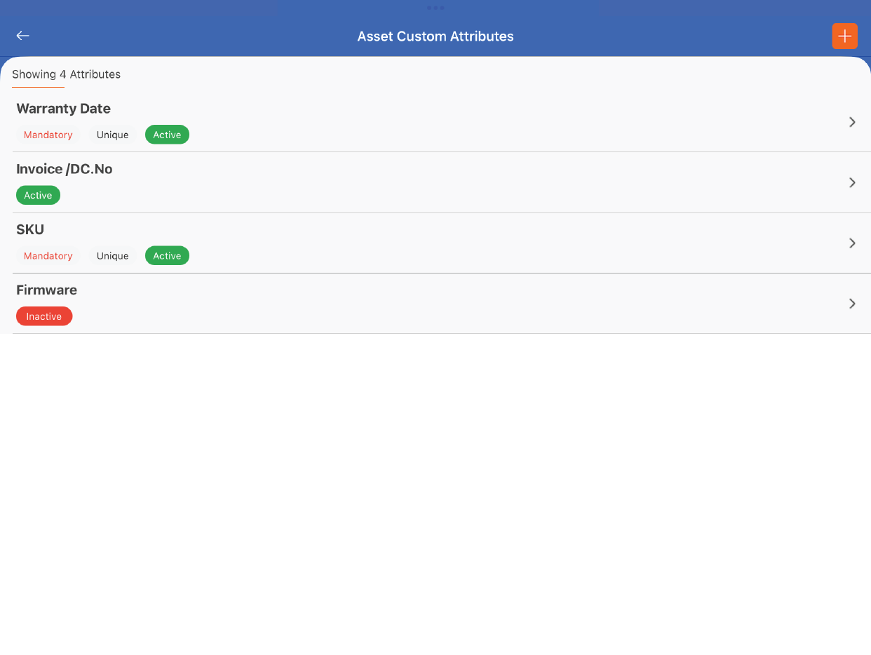 Press Create Attribute to complete adding the custom attribute. The newly added custom attribute will be displayed on the custom attribute list page. Only active state custom attributes are used for creating an asset.p>