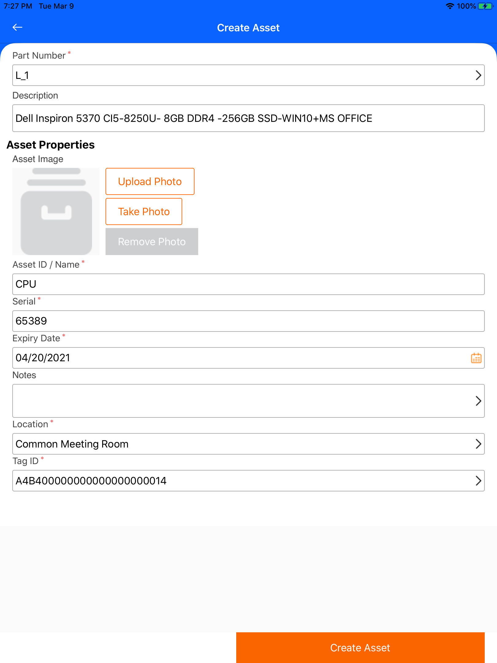 Fourth Step: Part number, description and location can be auto-generated based on the created part master and location. You need to enter assets name, serial number, expiry date and Tag ID. If you already connected the reader, please scan the tags/barcode using RFID Handheld Readers or entered manually.