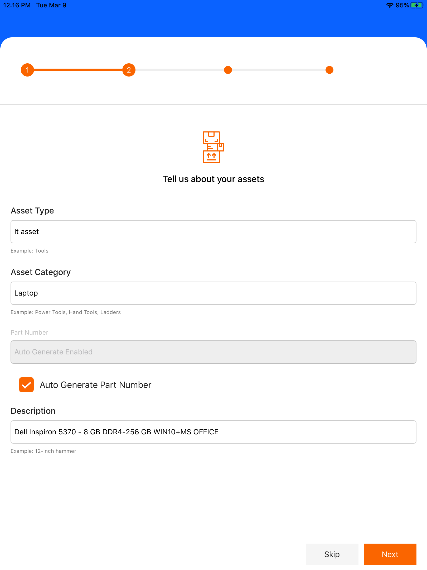 Second step - After creating the location we need to add part details for the assets. Enter the assets type, asset category, part number and description then click next to save the part details. In these part number can be created by any one of below