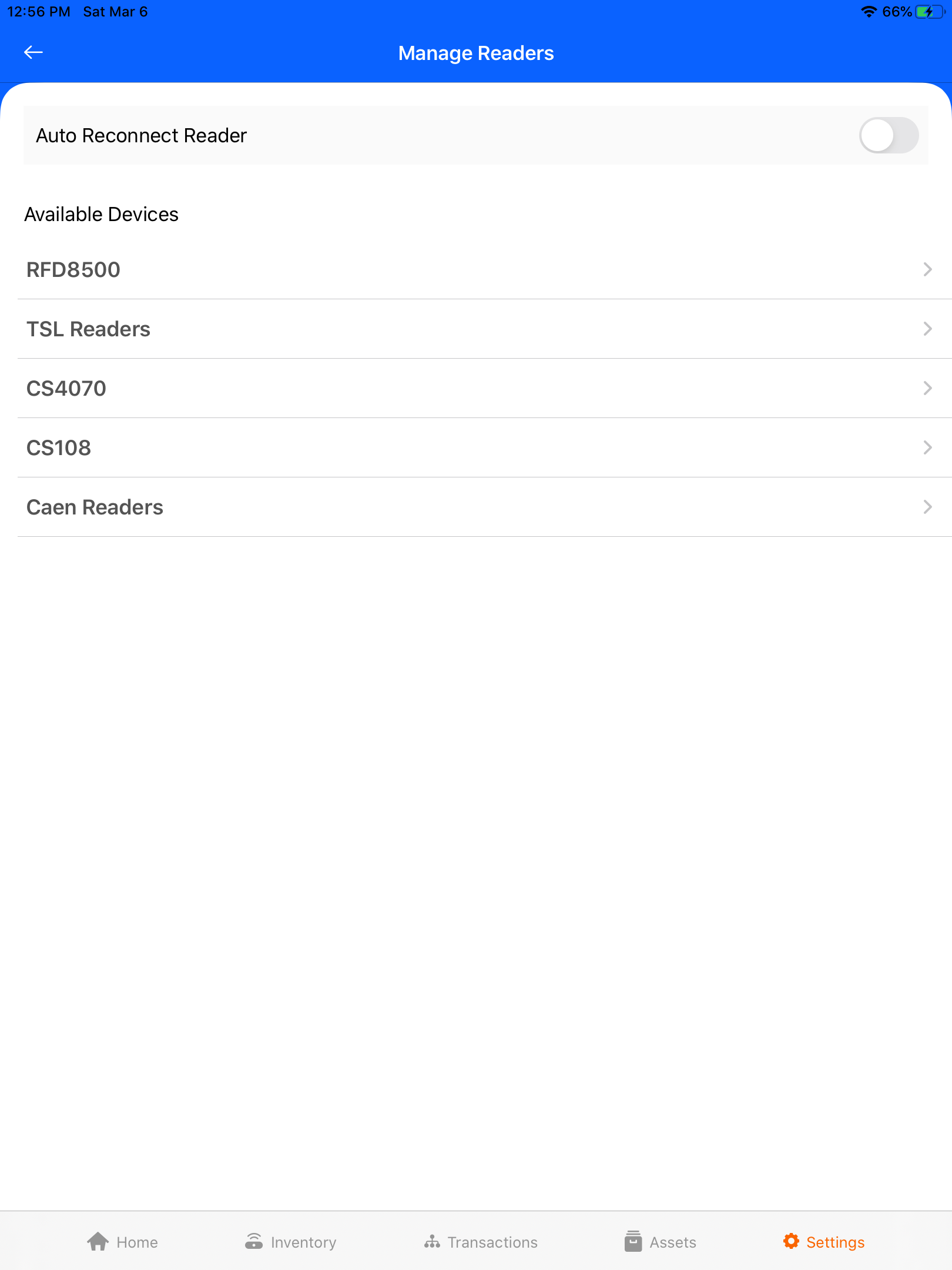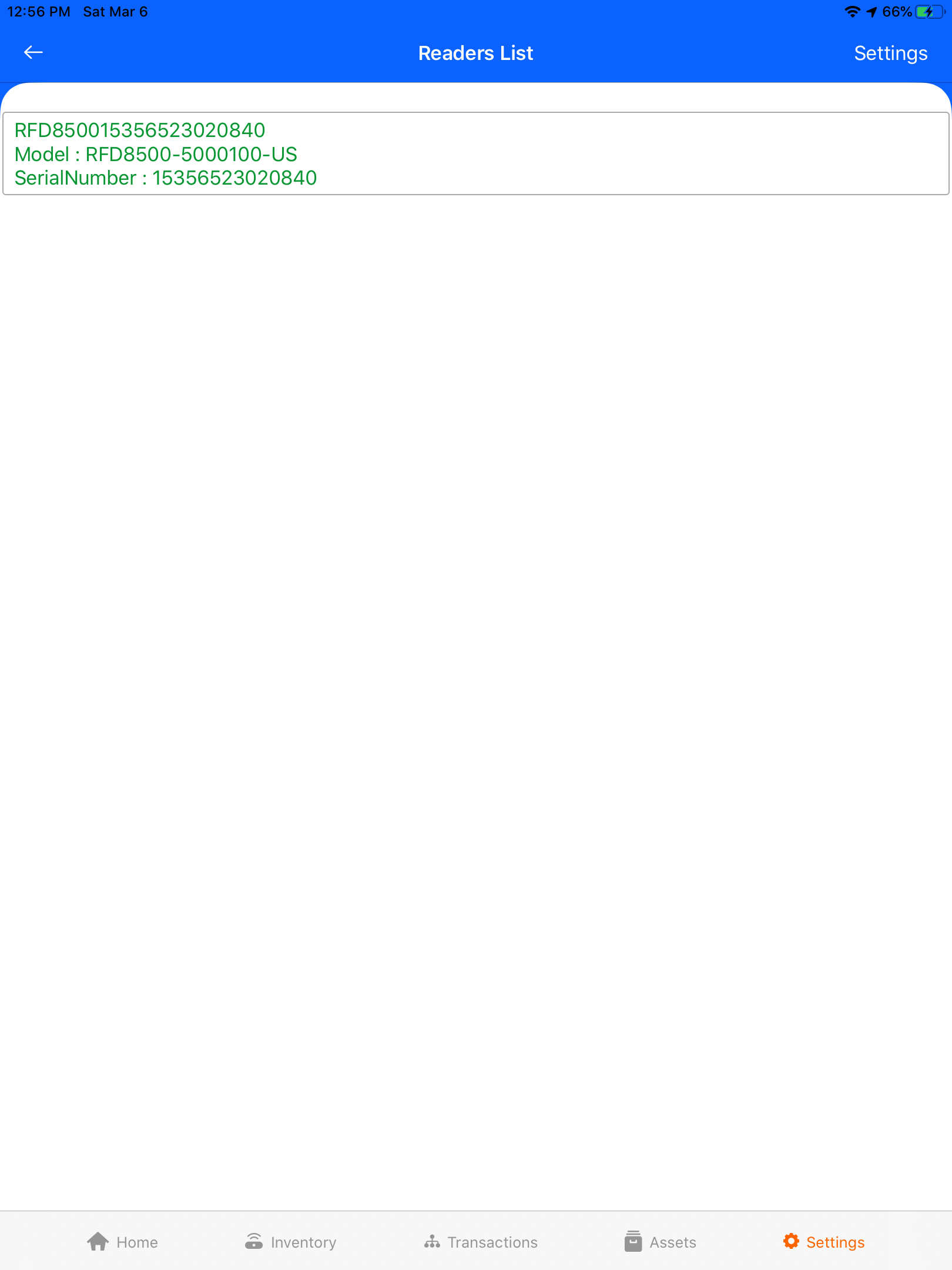 Click tap to connect the device, it redirects to the manage readers for connecting the RFID handheld readers to the application. Select the reader from available device that are already paired with your device.Once the reader is connected successfully a popup alert will appear.