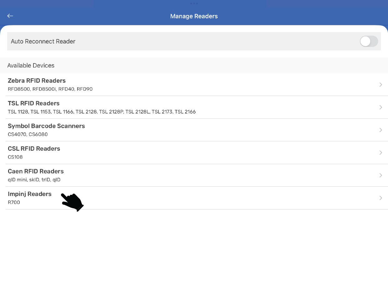 Once the reader is connected, when clicking the R700 reader from the managed reader will take the reader details page. This page offers options for disconnecting the reader and configuring settings for the reader.
