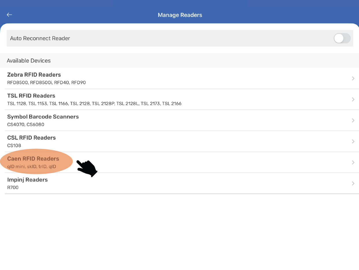 3. Tap on "CAEN RFID Readers" to connect Caen qID Mini with the application.